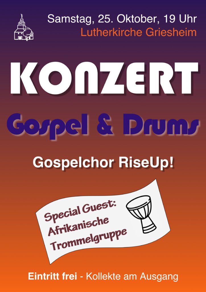 Herzliche Einladung zum Gospelkonzert „Gospel & Drums“ am Samstag, 25.10.2025 um 19.00 Uhr in der Lutherkirche mit dem Gospelchor RiseUp!, dem derzeit aktiven Gospelprojektchor und einer afrikanischen Trommelgruppe.