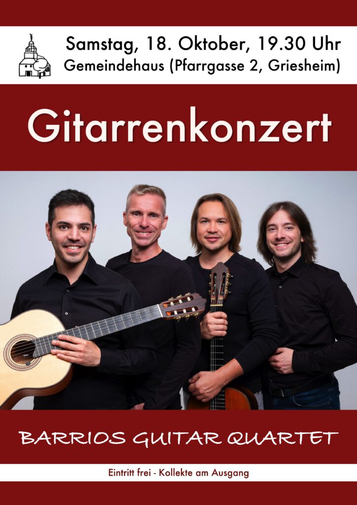 Am Samstag, 18.10.2025 um 19.30 Uhr spielt das Barrios Guitar Quartet im Gemeindehaus der Luthergemeinde, Pfarrgasse 2 in Griesheim. Herzliche Einladung dazu!