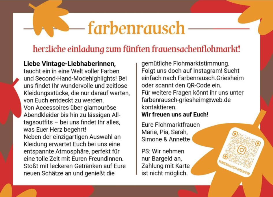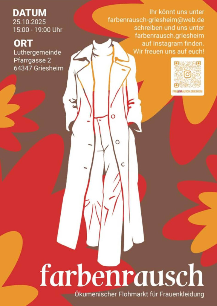 Herzliche Einladung zum Ökumenischen Frauensachenflohmarkt am Samstag, 25.10.2025 von 15.00 – 19.00 Uhr im Gemeindehaus der Luthergemeinde, Pfarrgasse 2 in 64347 Griesheim.