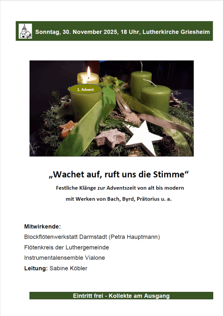 Herzliche Einladung zum Adventskonzert mit der Blockflötenwerkstatt Darmstadt (Petra Hauptmann), dem Flötenkreis der Luthergemeinde und dem Instrumentalensemble Vialone unter der Leitung von Sabine Köbler am 1. Advent, 30.11.2025 um 18.00 Uhr in der Lutherkirche.