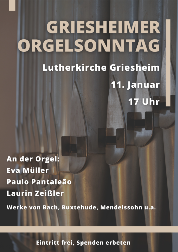 Der erste Orgelsonntag des neuen Jahres wird mit der geballten Kraft von drei OrganistInnen bestritten: Die drei Kirchenmusik-Studierenden Eva Müller, Paulo Pantaleão und Laurin Zeißler aus Frankfurt begrüßen Sie am 11.01.2025 um 17 Uhr mit festlicher Orgelmusik in der Griesheimer Lutherkirche.